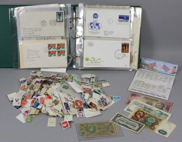 Group of assorted materials including one (1) album of foreign first day covers, a bag of loose, unsorted foreign stamps (over five hundred in all), six (6) paper money bills, including two (2) series 651 military payment certificates, and bills from Japan, India, USSR and elsewhere.