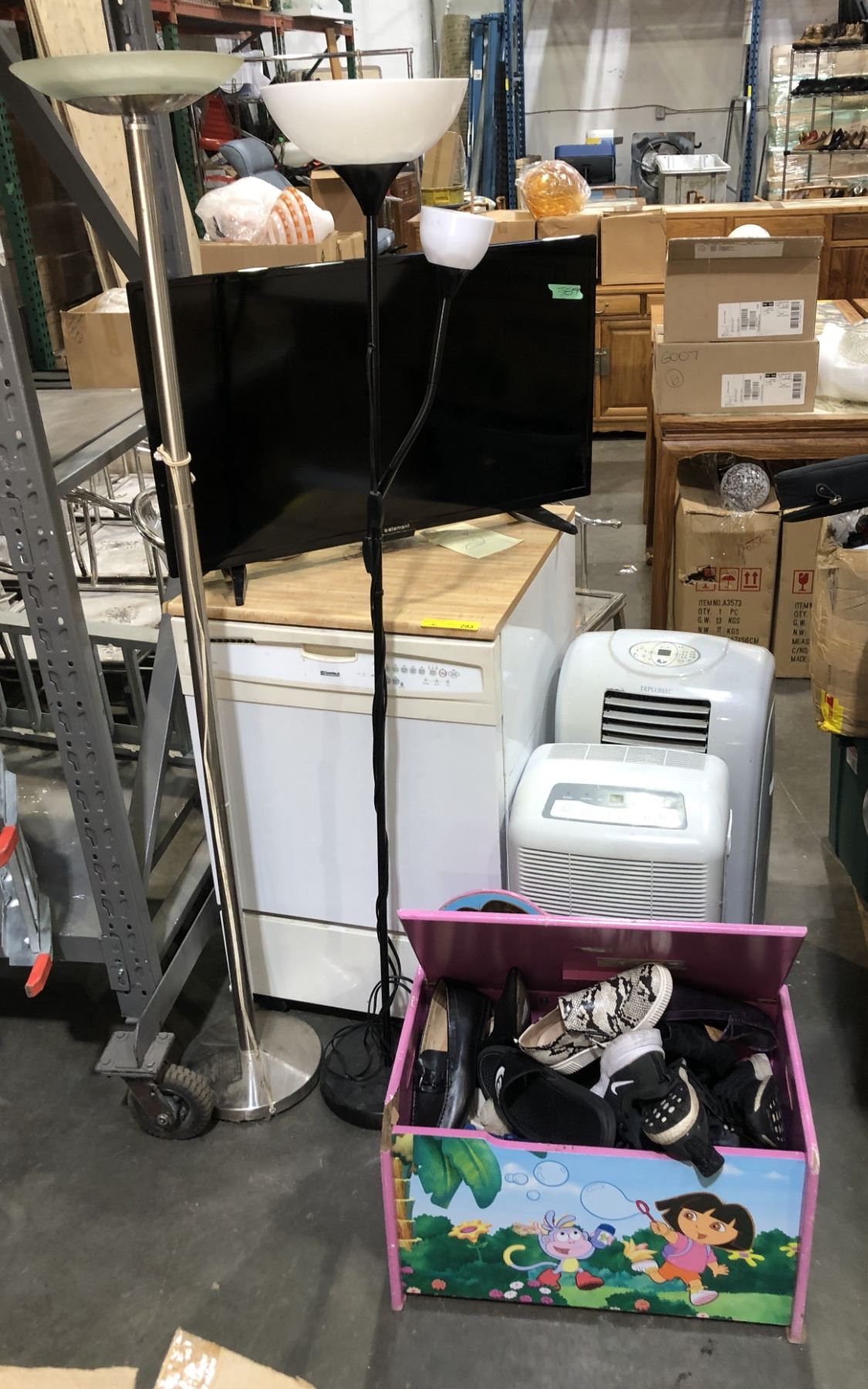 Group of assorted misc - includes Kenmore dishwasher / 2 air conditioners / floor lamps & Element 40" TV / box of shoes etc