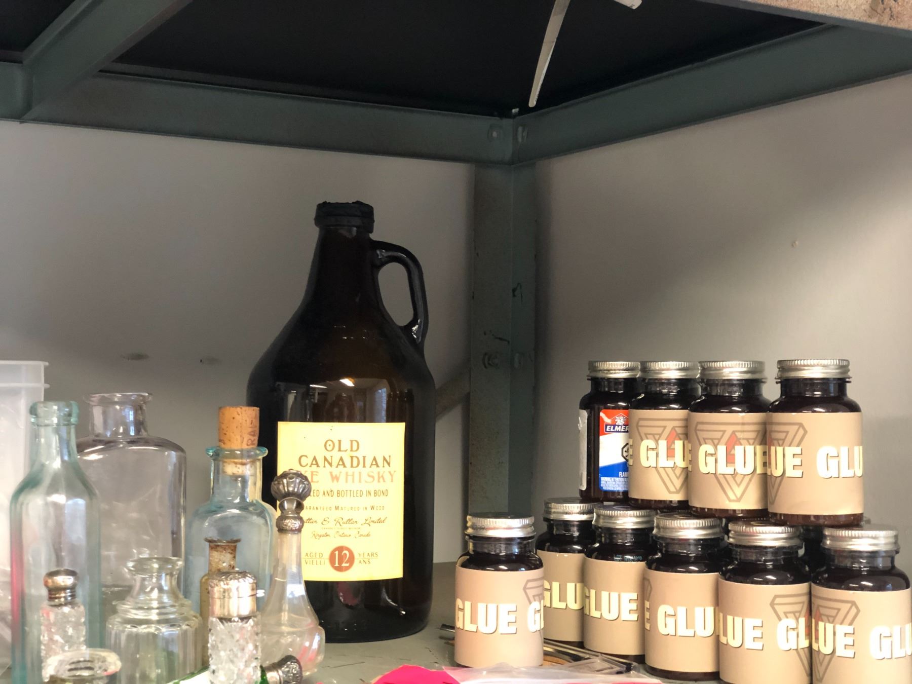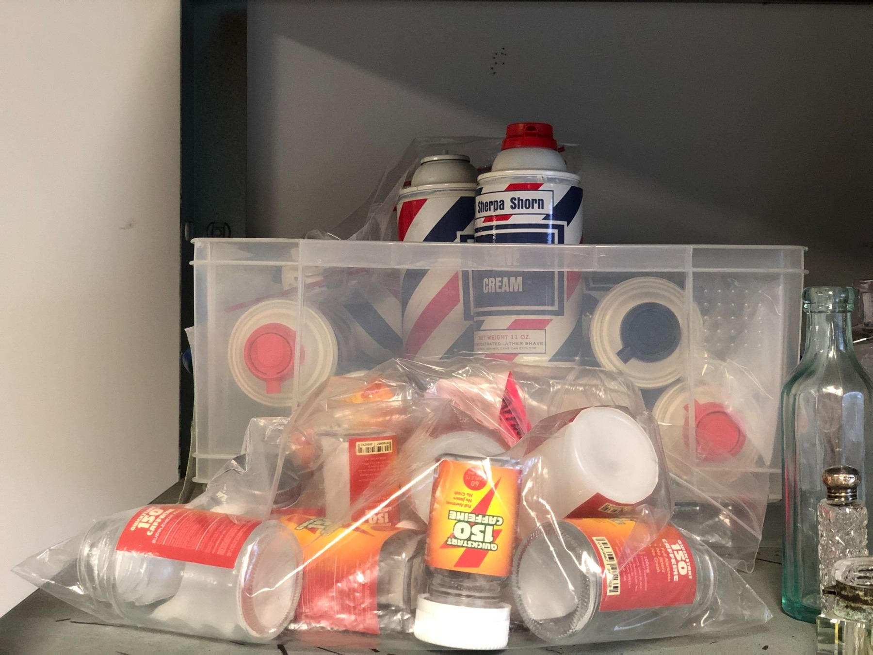 Group of assorted props - perfume bottles / shaving cream bottles / caffeine pills / glue - multiple ep. & scenes (From the superhero show)