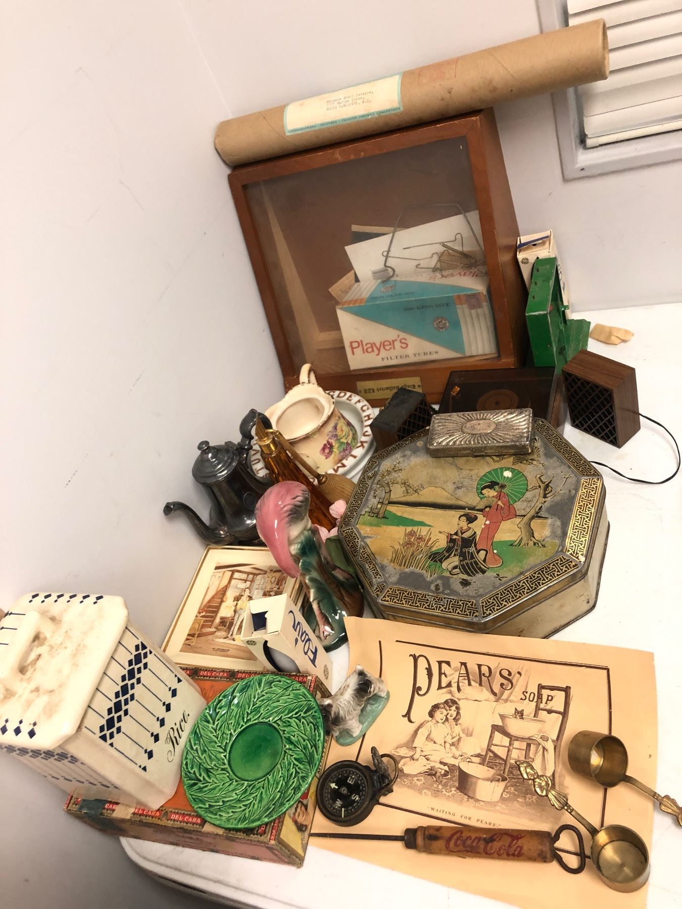 Group of assorted vintage estate items - includes Kings limited display box / chinese decor tin box / mini record player w/ speakers etc