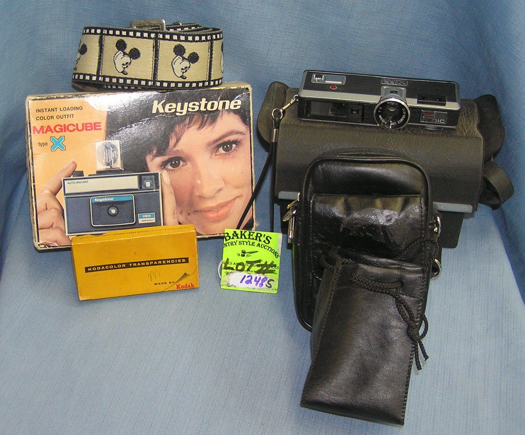 Group of cameras, cases and collectibles, this lot also includes an early Mickey Mouse strap est. value $65.00-$75.00