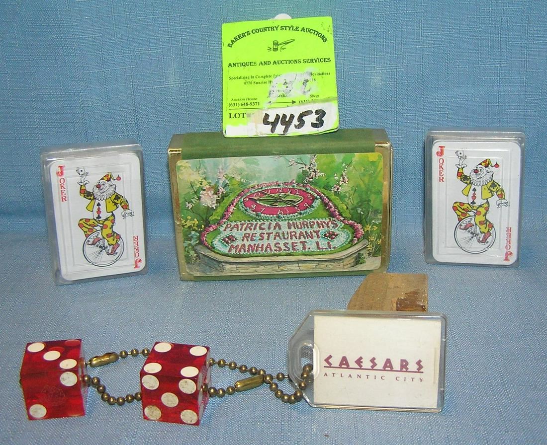 Group of cards and dice includes one advertising deck of cards, 2 mini decks, Caesar's souvenir dice key chain and 1 mini dice est. value est. value $30.00-$40.00