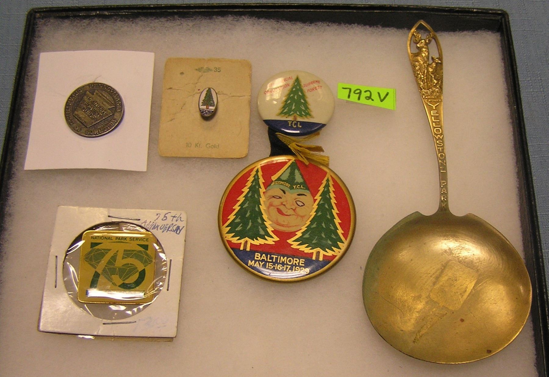 Group of early forestry collectibles includes PA pioneer forest guide badge by Whitehead and Hogg, enameled and 10 krt gold pin on card Baltimore forest convention badge 1929 yellow stone park souvenir oversized spoon and more. est. value $200.00-$250.00