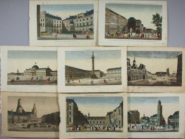 Group of eight (8) early 19th Century hand colored engravings of dioramic views, 'Vue de la Place de L'Hotel de Ville et du Phare a Calais'; 'Vue de la place D'armes de Graveunes'; 'Cour des Fontaines a Fontainebleau' (edge tear); 'Vue de L'Hotel de Ville de Paris de la Place'; 'Vue de la Place Vendome'; 'Vue de la Place Victoires a Paris'; 'Vue de la Terrasse de Chester, du Cousee, des Places de St. Andre et du Parc, au Parc du Regent a Londres'; 12 5/8" x 19" (disbound from folio), published by Chez Basset, Rue St. Jacques No. 64, Paris, unframed. Some foxing and edge chips.