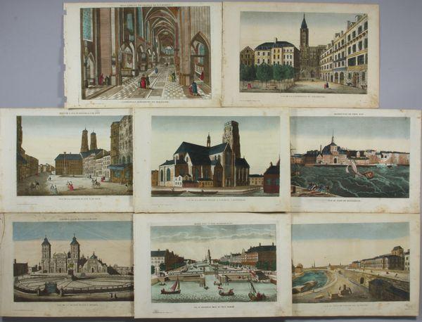 Group of eight (8) early 19th Century hand colored engravings of dioramic views, 'Vue de la Grande Place a Mexico'; 'Vue de la Grande Place a Munich'; 'Vue du Pont de Vienne en Autriche' (edge tear); 'Vue d'Amerdam Prix du Vieux Marche'; 'Vue du Port de Rotterdam'; 'Vue de la Grand Ellise St. Laurent a Rotterdam'; 'Cathedral Dordrecht en Hollande'; 'Vue de la Cathedrale de Strasbourg'; 12 5/8" x 19" (disbound from folio), seven (7) published by Chez Basset, Rue St. Jacques No. 64, Paris, and 1 (one) published by Chez Hacquart, Rue St. Jacques, No. 64, Paris, unframed. Some foxing, edge chips.