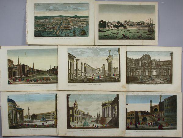 Group of eight (8) early 19th Century hand colored engravings of dioramic views, 'Vue de l'Ancienn Babylone'; 'Vue de la Fontaine des Amants et Mosque Adjacente (Egypte)'; 'Vue du Grand Caire, (Egypte)'; 'Temple du Soleil, A Palmyre'; 'Vue de L'Ancienne Ville de Palmyre, en Asie'; 'Ruines de Palmyre, en Syrie'; 'Vue de la Ville de Batavia'; 'Vue de la Place et des Casernes de Top-Hane, a l'Entree du Port de Constantinople' (mounted on cardboard); 12 5/8" x 19" (disbound from folio), four (4) published by Chez Basset, Rue St. Jacques No. 64, Paris, and four (4) published by Hacquart, Rue St. Jacques, No. 64, Paris, unframed. Some foxing, edge tears.