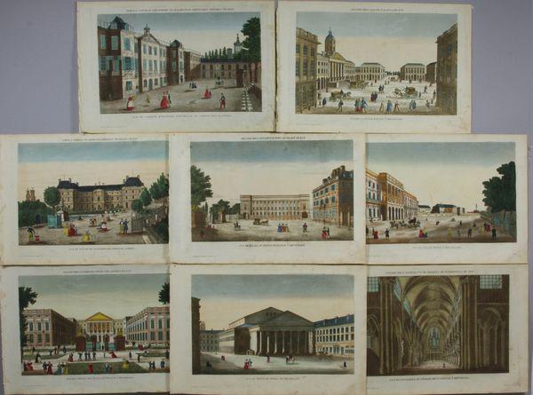 Group of eight (8) early 19th Century hand colored engravings of dioramic views, 'Vue de la Place Royal a Bruxelles'; 'Vue du Cabinet d'Histoire Naturelle au Jardin des Plantes'; 'Vue du Palais du Prince d'Orange a Bruxelles'; 'Vue du Theatre Royal de Bruxelles'; 'Vue du Palais Royal a Bruxelles'; Vue de l'interiur de l'Eglise de St. Gudulle a Bruxelles'; 'Vue du Palais du Luxembourg du Jardin'; 'Vue de l'Hotel des Etats Generaux a Bruxelles'; 12 5/8" x 19" (disbound from folio), published by Chez Basset, Rue St. Jacques No. 64, Paris, unframed. Some foxing, edge tears.