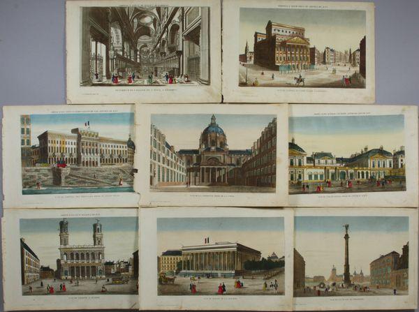 Group of eight (8) early 19th Century hand colored engravings of dioramic views, 'Vue de l'Hotel du Lord Maire a Londres'; 'Interieur de l'Eglise de St. Paul a Londres'; 'Vue de la Sorbonne Prise de la Cour' (edge tear); 'Vue du Palais Royal Prise du Chateau d'Eau'; 'Vue du Palais de la Bourse'; 'Vue de la Place du Chatelet'; 'Vue de l'Hotel des Monnaies Prise du Pont Neuf'; 'Vue de l'Eglise St. Sulpice'; 12 5/8" x 19" (disbound from folio), seven (7) published by Chez Basset, Rue St. Jacques No. 64, Paris, and one (1) published by Chez Hacquart, Rue St. Jacques No. 64, unframed. Some foxing, edge tears.