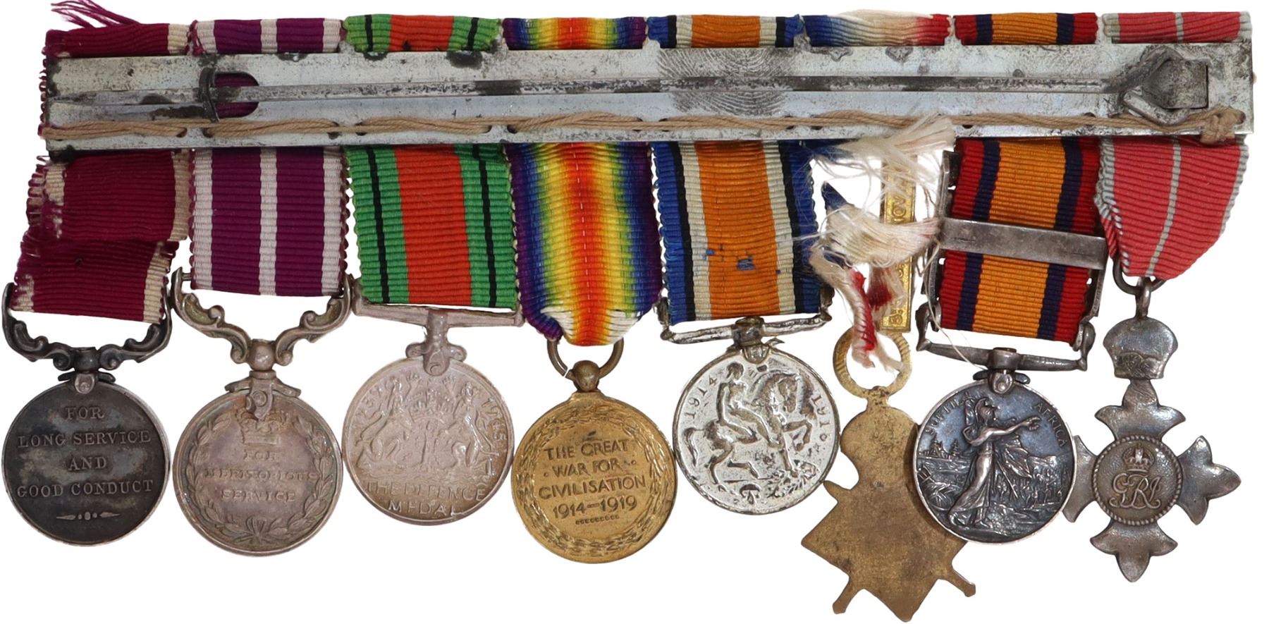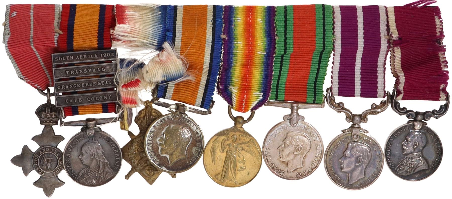 1: Order of British Empire, 1st World War, The Most Excellent Order of the British Empire, M.B.E. (Military) Member’s 1st type Miniature breast badge, Silver, 2: Anglo-Boer War (1899-1902), Victoria Queen, Queen's South Africa Miniature Medal with four Clasps "South Africa 1902, Transvaal, Orange Free State, Cape Colony", Silver, 3: British and Imperial Forces (1914-15), 1st World War, Star Miniature Medal with clasp, Bronze, 4: 1st World War, British War Miniature Medal (1914-18), Silver, 5: Victory Miniature Medal (1914-19), Bronze, 6: 2nd World War, The Defence Miniature Medal, King George VI, Silver, 7: Meritorious Service Miniature Medal, King George VI, Silver, 8: Army Long Service and Good Conduct Miniature Medal (1911-20), King George V, Silver, group court mounted as worn, all in good condition, minor ribbon damage for star medal, Extremely Rare.