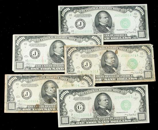Group of five 1934 and 1934-A $1000.00 Notes. Lower grade notes, some are damaged. Lot of 5 notes.