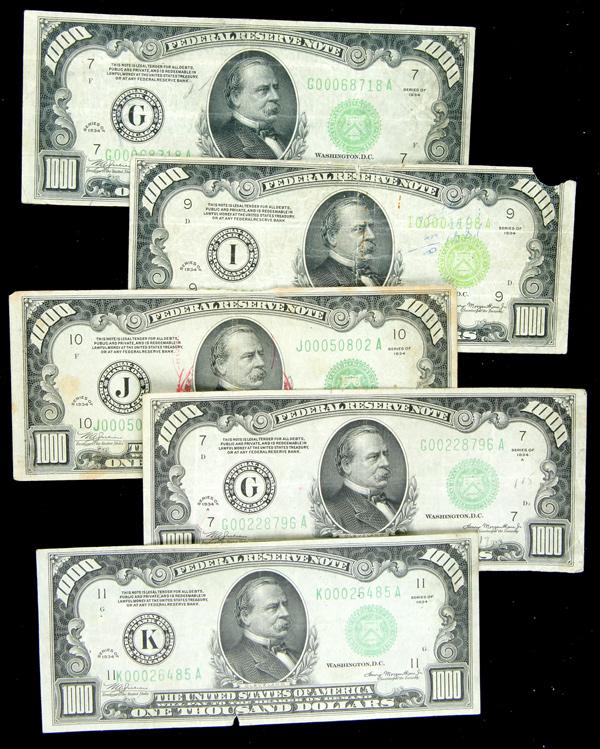Group of five 1934 and 1934-A $1000.00 Notes. Lower grade notes, some are damaged (one with corner missing). Lot of 5 notes.