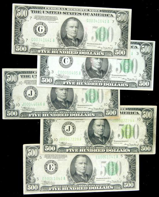 Group of five 1934 and 1934-A $500.00 Notes. Lot of 5 notes. Very Good to Fine.