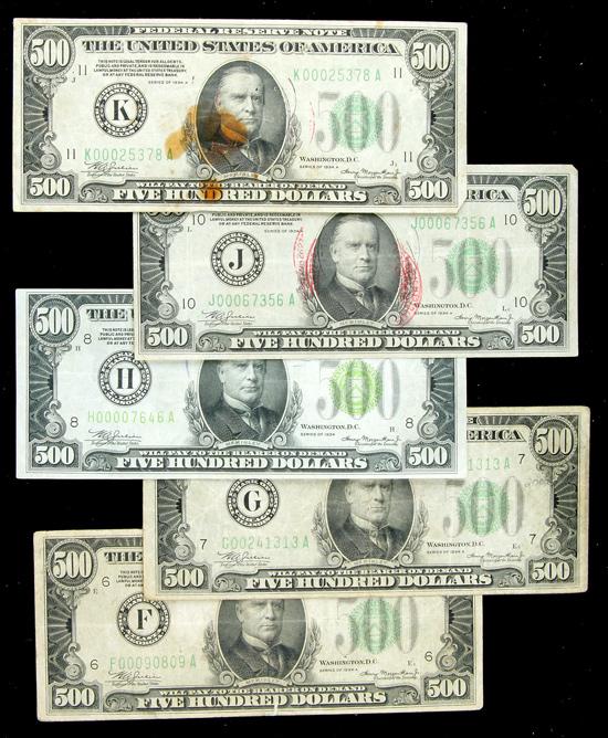 Group of five 1934 and 1934-A $500.00 Notes. Lower grades notes, some damaged. Lot of 5 notes.