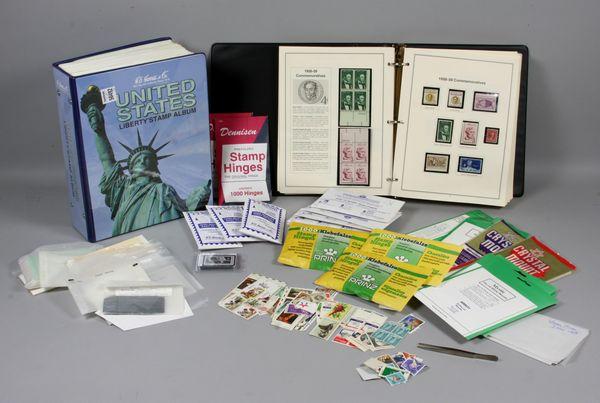 Group of four (4) philatelic items, including one (1) U.S. stamp album of all U.S. stamps, most pages complete including comemoratives, duck stamp, and first day issues; small bag of loose U.S. stamps; box of stamp collecting supplies and four (4) albums of U.S. commemoratives, 1935-1991, most pages complete. Good condition.