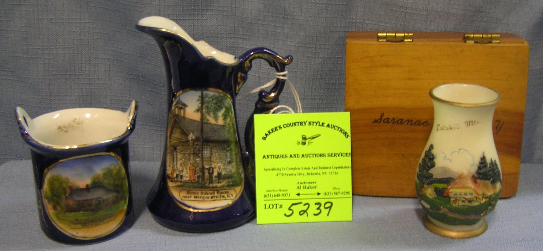 Group of four early souvenirs from New York includes pitcher, bucket, vase and trinket box est. value $150.00-$200.00