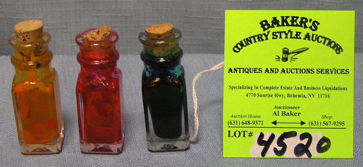 Group of three miniature antique bottles possibly ink or paint most still with content $35.00-$45.00