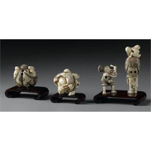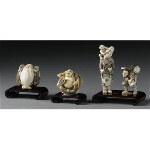 <B>Group of Four Netsuke<BR></B></I><BR>Group includes four male figures, of varying sizes, with wood stands<BR>Tallest: 3-1/4in. high<BR><BR> <B>Condition Report:</B> Normal signs of wear as appropriate with age.<BR><BR><b>Shipping:</b> Miscellaneous Collectibles, Larg (<a target="_blank" href="http://www.heritageauctions.com/common/shipping.php">view shipping information</a>)