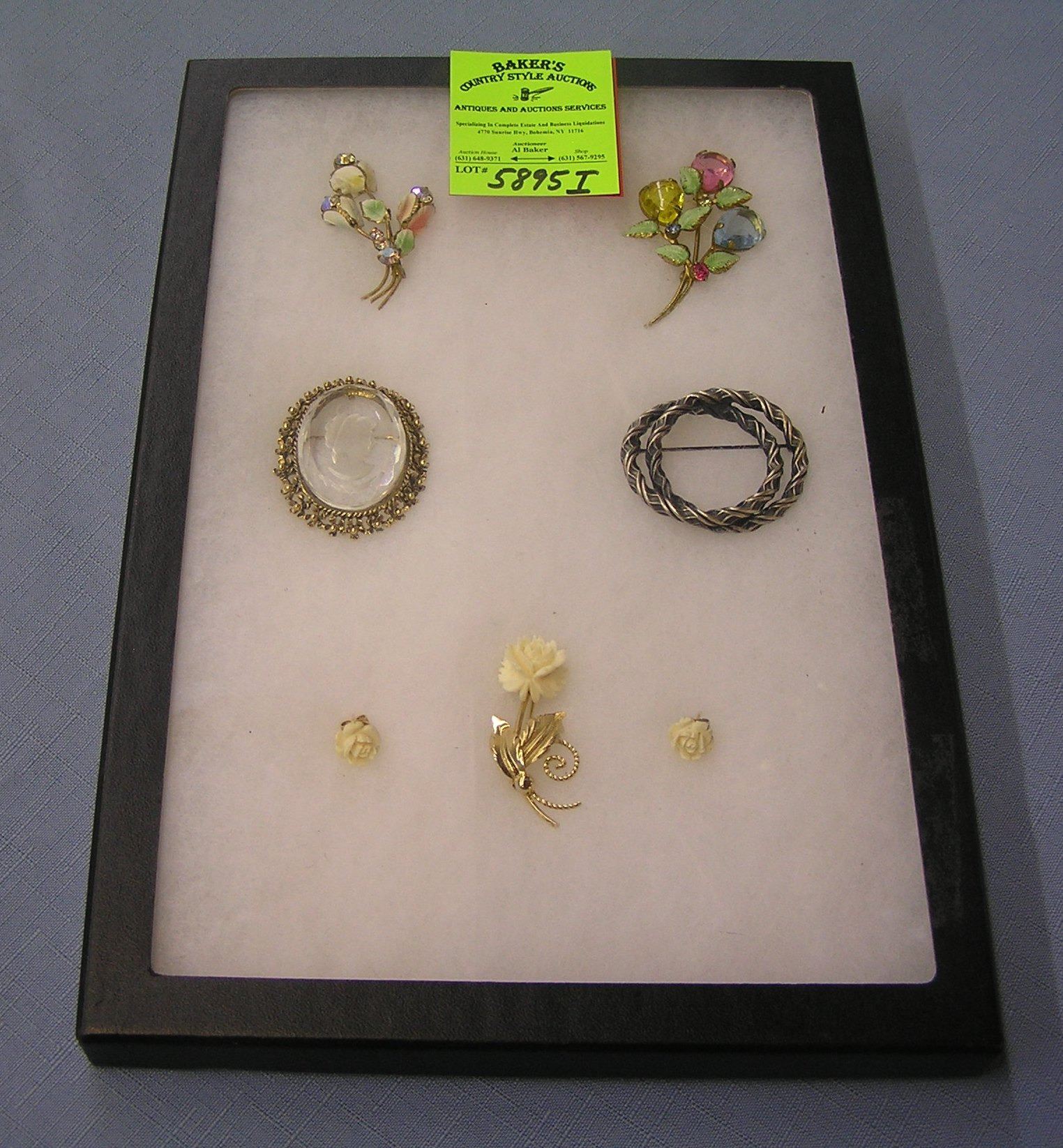 Group of high quality pins and earrings includes hand painted Austria, Helana 14k gold filled, flower pin and earring set, cameo and more est. value $75.00-$100.00