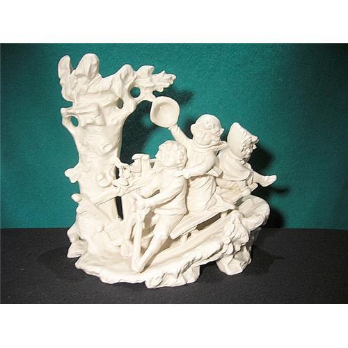 Beautiful group of kids in a sleigh in a garden made in Biscuit. With little fixed parts as you can see in the last picture. With space to put flowers as you can see in the last picture. Probably from Germany.