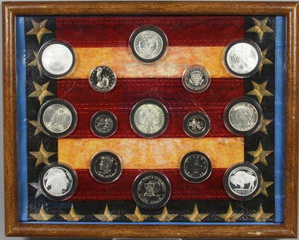 Group of large and small coin commemoratives, proof sets, tokens and other misc., plus a proof set of large silver half dollars, dollars and other commemoratives, in frame. Good condition.