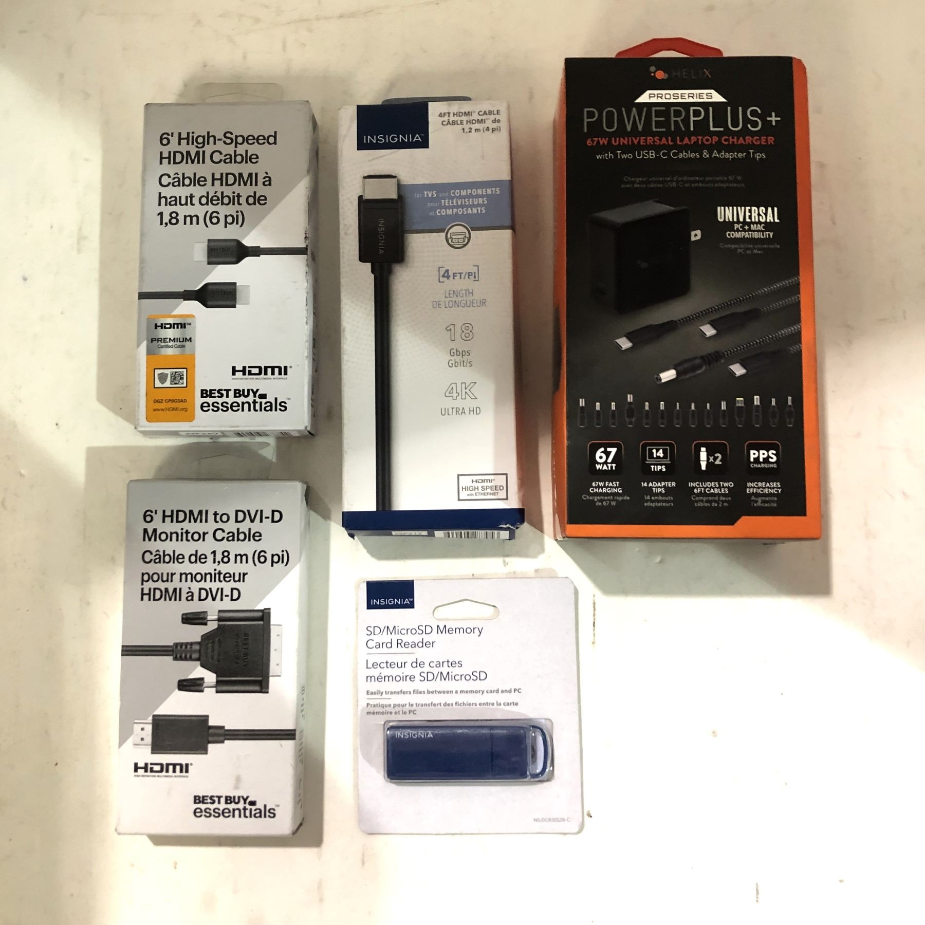 Group of misc electronics including - power plus + 67W universal laptop charger, 2x 6' High-speed HDMI, 4ft HDMI cable & SD/micro SD card reader