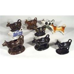 Group of nine Victorian and later pottery cow cream jugs including Staffordshire Fresian cow, Willow patterned cow, etc, largest 13cm high
