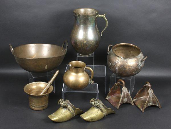 Group of seven (7) 17th-18th Century Spanish Colonial copper and brass to include one (1) pair of copper stirrups, one (1) pair of brass stirrups, one (1) handled copper bowl, one (1) handled brass chocolate pot (some perforations), one (1) brass mortar and pestle, one (1) handled brass bowl, and one (1) handled brass pitcher; chocolate pot is 10 1/2" h.