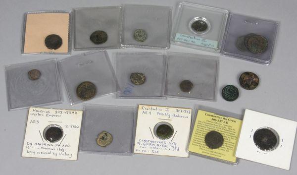 Group of various Roman and Byzantine coins, including coins of Constantine I, Honorius, Valens, Constantius II, and two (2) Afghan first century Kushans, seventeen (17) coins total. Good condition.