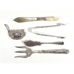 Group of silver items including a Whisky label, silver handled bread fork, sugar tongs etc