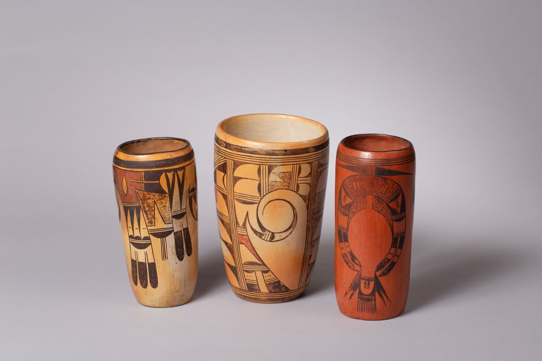 A group of three historic Hopi polychrome pottery cylinders, dating to the 1920s-1930s. These finely crafted pieces exhibit the bold, thick-walled construction and design characteristic of the period.