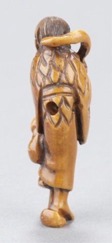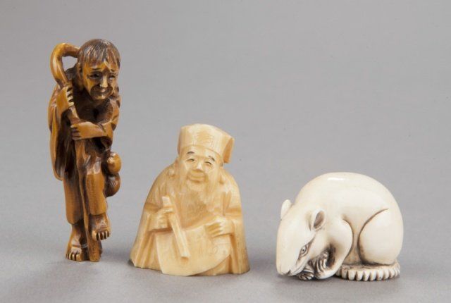 Mid 20th century. The first, a Chokwaro Sennin standing on one foot and holding onto his staff, stained a light brown. Signed on the underside. 2 5/8in (6.6cm). The second, a scholar standing and holding a scroll. Signed on the underside. 1 5/8in (4.2cm). The third, a large rat holding some sort of vegetable in his front paws. Signed illegibly on the underside. 1 3/4in (4.4cm).