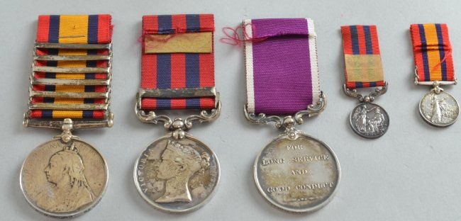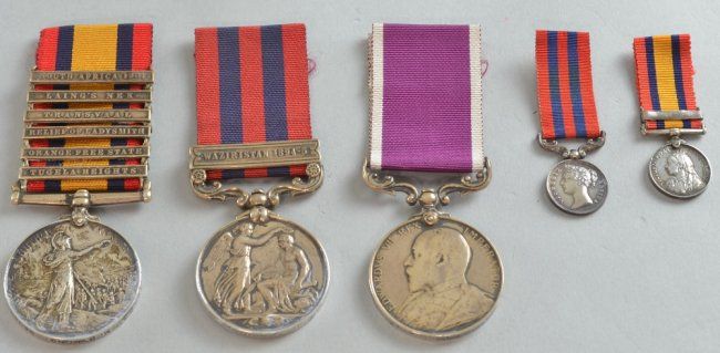 Group of three medals, Indian General Service medal and miniature with clasp Waziristan 1894-5, Queen Victoria South Africa medal and miniature with 6 clasps South Africa 1901, Laings Nek, Transvaal, Relief of Ladysmith, Orange Free State, and Tugela Heights, and an Edward VII Long Service Medal, 2658 PTE. M Dymond, Devon Regt. NOTE M Dymond recorded as wounded at Ladysmith 23/2/1900. Joined the Regiment circa 1890