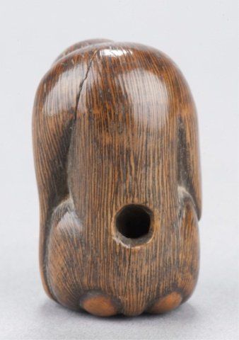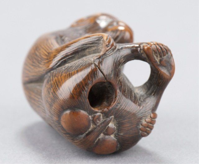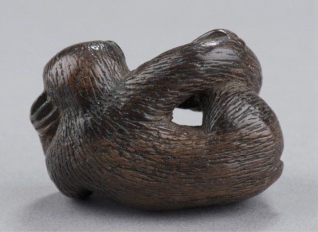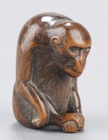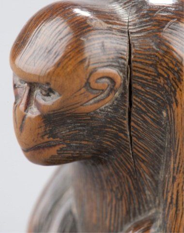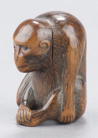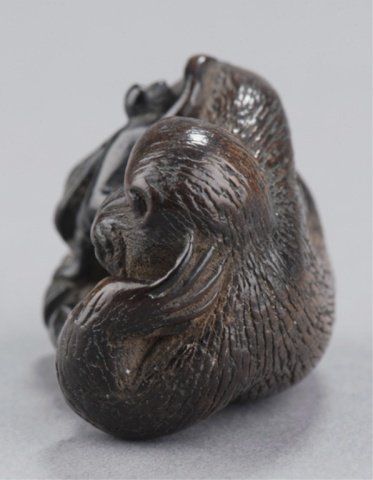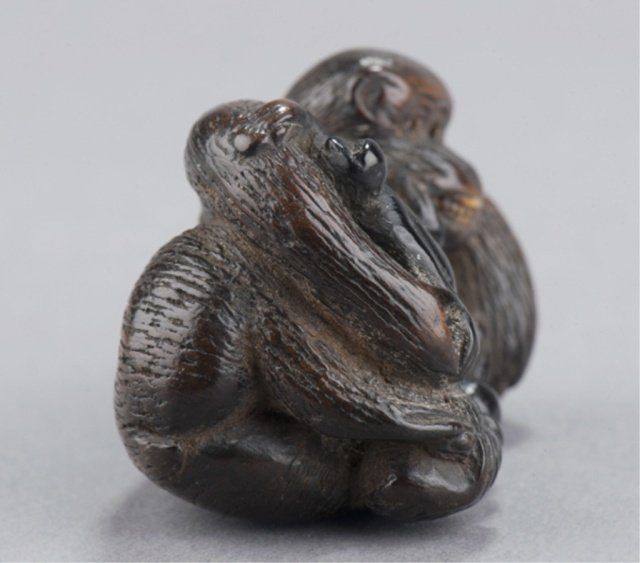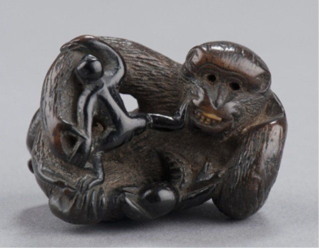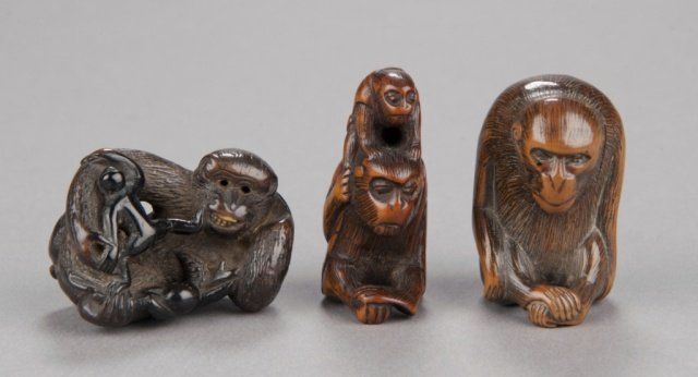 Early 19th century. The first, kaki wood, an adult monkey reclining on his side, while the young monkey climbs on his knee. 1 1/4in (3.2cm). The second, two monkeys performing as Manzai Dancers, both wearing tunics, one sits atop the other's head and shoulders. 1 3/4in (4.5cm). The third, seated upright with feet crossed, the left arm at his side with the hand cupped under his thigh, the right arm resting on his right knee. 1 3/4in (4.4cm).