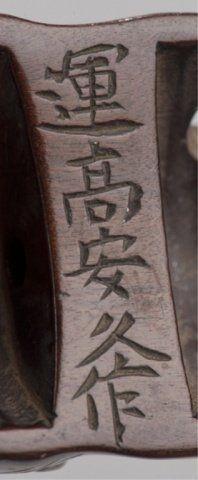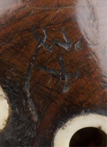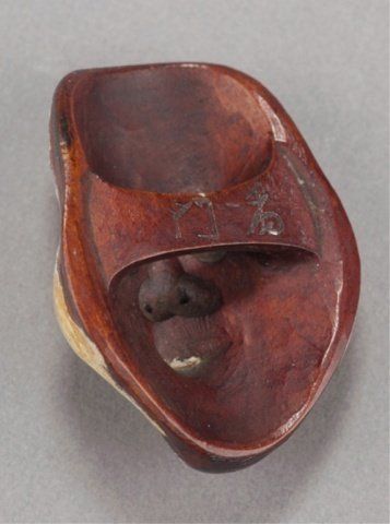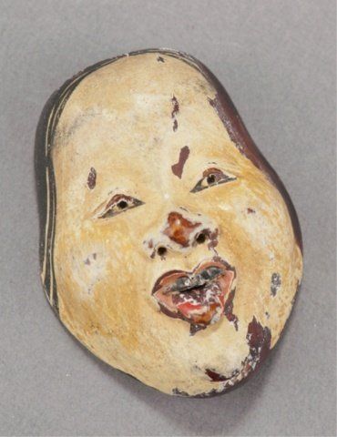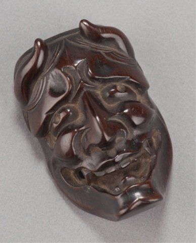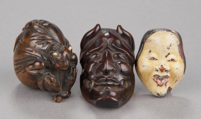 Early/mid 19th century. The first, an Oni squatting against a large sack in which he has captured Shoki and whose face can be seen protruding from the top. Signed on the underside, Tsuji. 1 5/8in (4.1cm). The second, a Tengu mask. Signed on the crossbar, by Unko Yasuhisa saku. 2in (5.1cm). The third, A Kyogen mask,wood with gesso and paint, possibly of Oto. Signed on the crossbar, Umon. 1 5/8in (4.1cm).