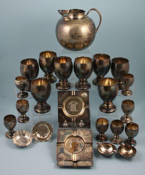 Group of South American silver to include one (1) pitcher with eight (8) large and eight (8) small goblets, two (2) nut dishes with bottoms made from 1880 Chilean one peso coins, and six (6) ashtrays (two (2) from Bogota Country Club). Silver marked 900 fine, most items are monogrammed 'cortes' or 'A de C', 69 troy oz. tw., good condition.