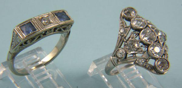 Group of two (2) rings, one (1) 14k white gold diamond and sapphire, size 6.5, .1oz, 3 dwt, good condition; one (1) 18k white gold and diamond size 5, .2 oz, 3 dwt tw., good condition.