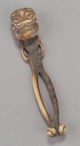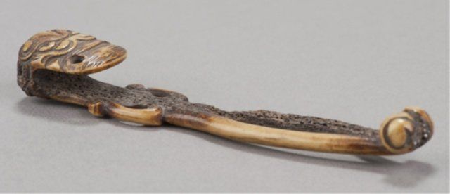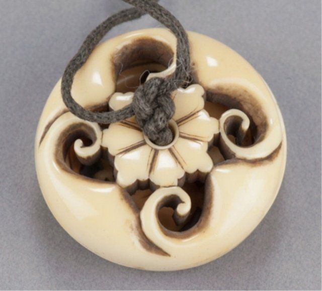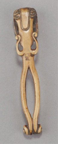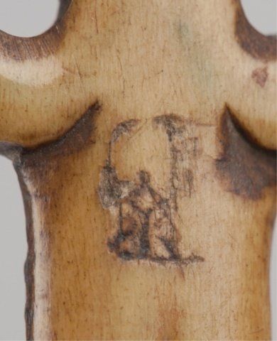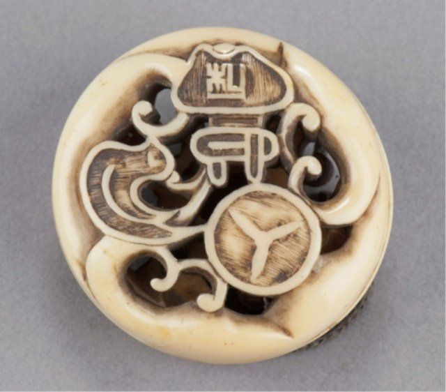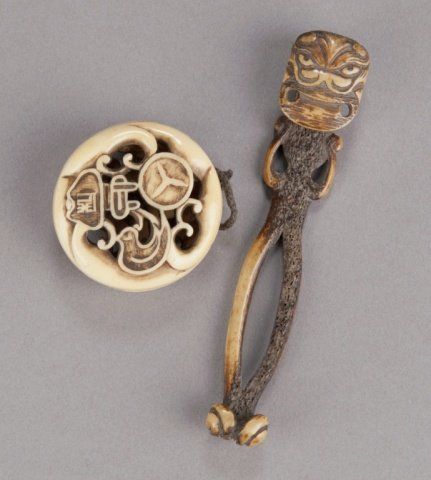 Kokusai school, Tokyo, Mid 19th century. The first, stag antler obihasami netsuke depicting a monster(squid?). Signed on the reverse, partly abraded. 4?in (10.7cm). The second, of ivory, showing a combination of kamon, characters, and symbols. The reverse has an eight-petal hanabishi design. 1?in (4.3cm). Provenance: The first, Purchased from Raymond Bushell 1957.