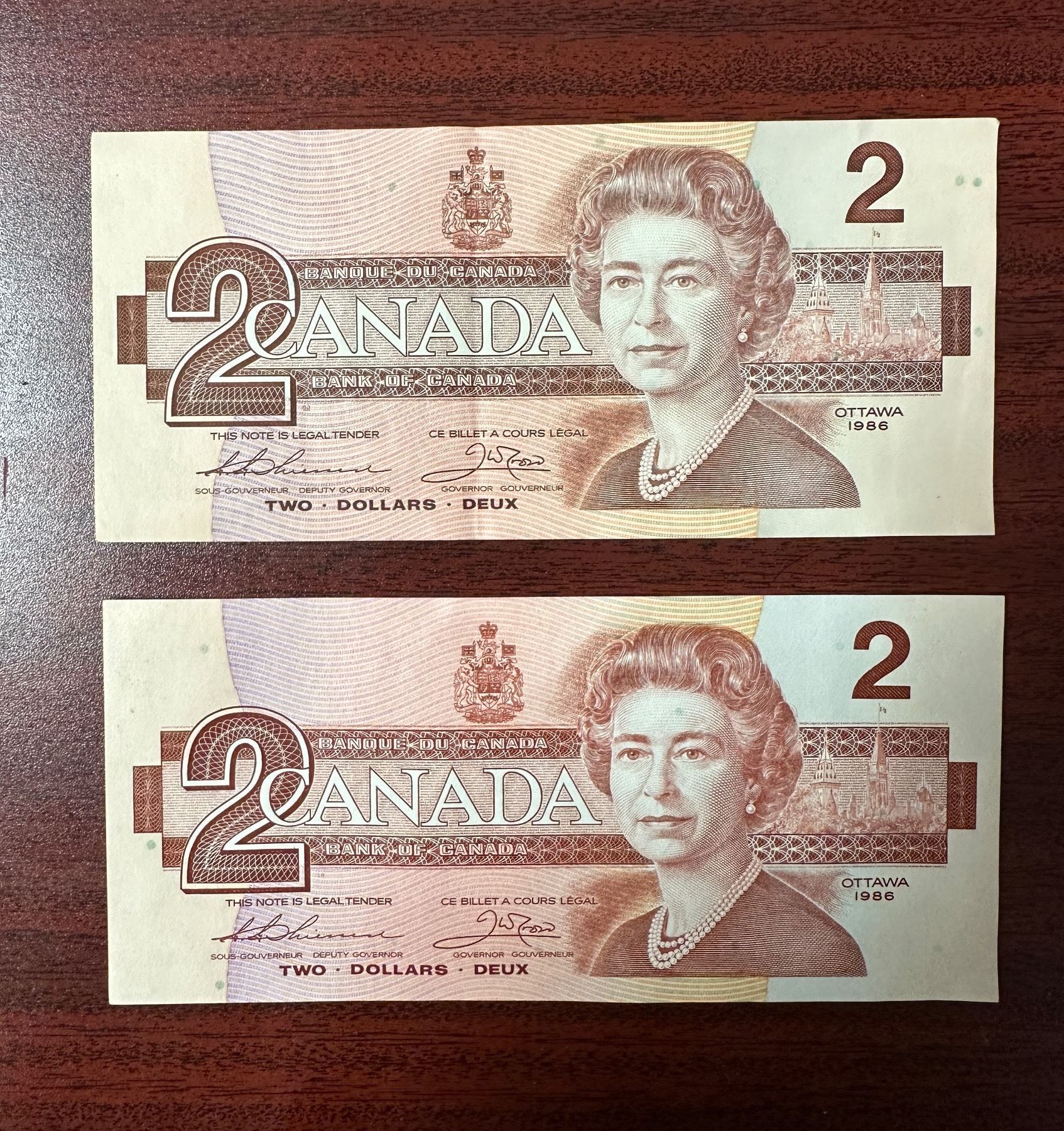 Group of two Bank of Canada 2 dollar bills from 1986