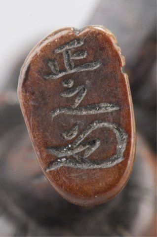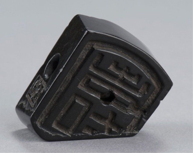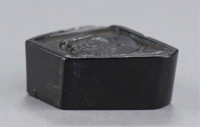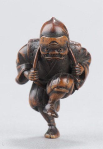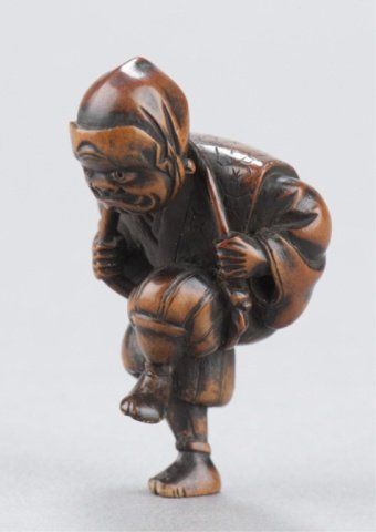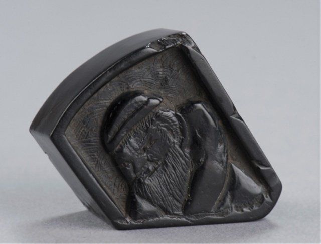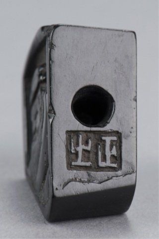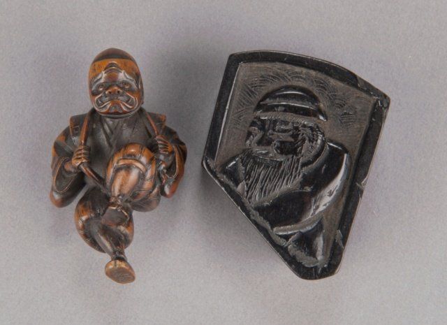 By Hoshunsai Masayuki, Tokyo, Mid 19th century. The first, an ink stick with face of an Ainu man on one side, and a partial seal on other, truncated to simulate a broken ink stick. Signed on an edge in a rectangular sunken reserve, Masayuki. 1?in (4.1cm). The second, a Noh dancer with mask, he stands on his right leg while his left is raised at the knee and supported by a band that passes around his neck. Signed on the bottom of the foot, Masayuki, plus kakihan. 1?in (4.7cm).