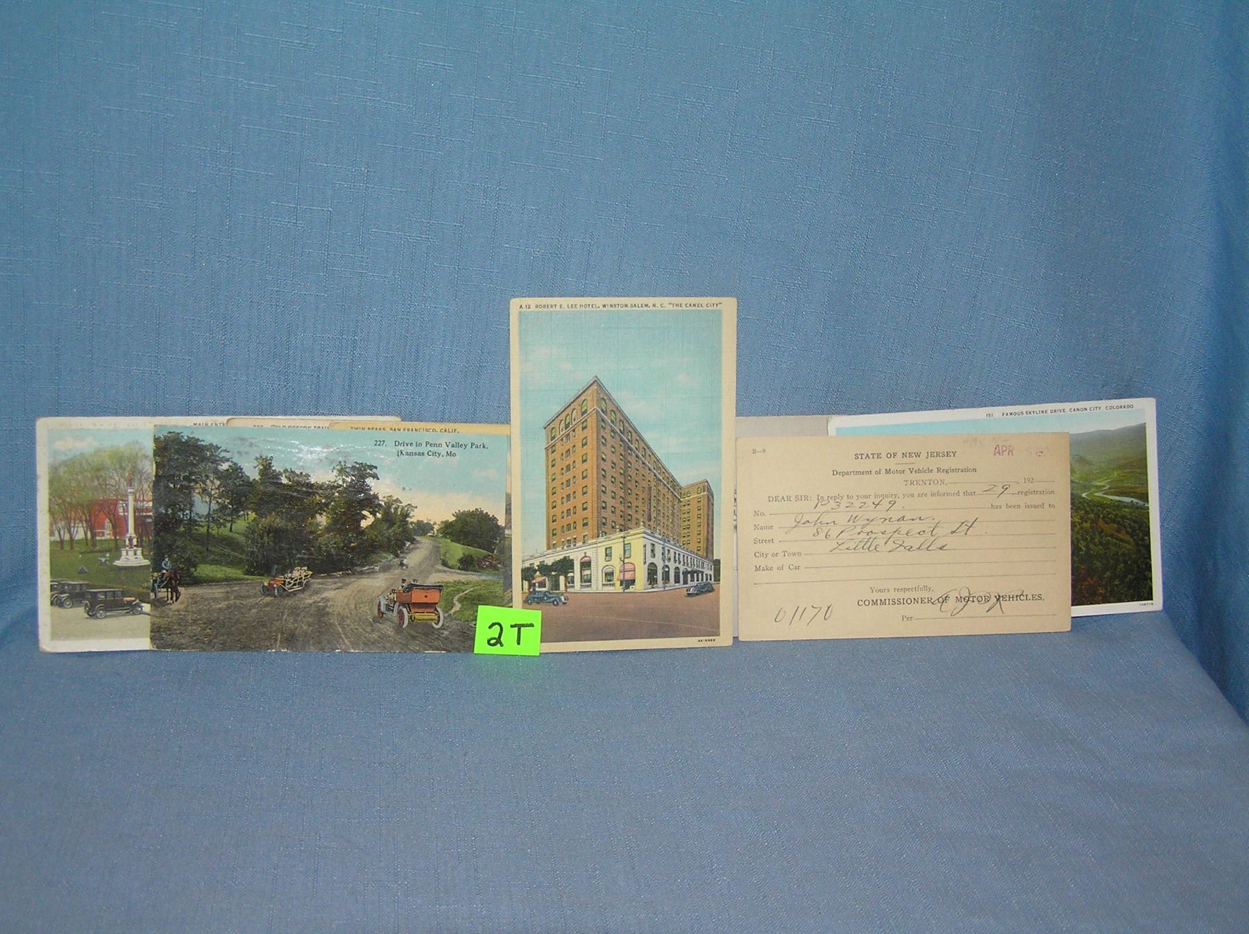 Group of vintage auto related post cards includes a 1929 registration card est. value $40.00-$50.00