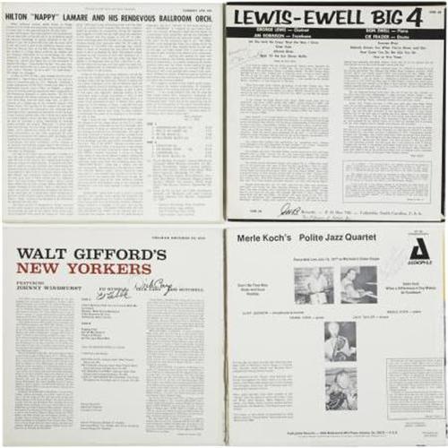 <B>Group Of Four signed Jazz LPs Including Hilton "Nappy" Lamere, Don Ewell, Walt Gifford, Merle Koch.</B></I> Each signed by some or all of the album's players. Includes <I>Hilton "Nappy" Lamere and his Rendezvous Ballroom Orchestra</B></I> signed by Lamere and Nick Fatool, George Lewis and Don Ewell's <I>Big 4</B></I> signed by Ewell, Walt Gifford's <I>New Yorkers</B></I> signed by Ed Hubble and Dick Cary, and Merle Koch's <I>Polite Jazz Quartet</B></I> signed by Koch.<BR><BR><b>Shipping:</b> Recordings (<a target="_blank" href="http://www.heritageauctions.com/common/shipping.php">view shipping information</a>)