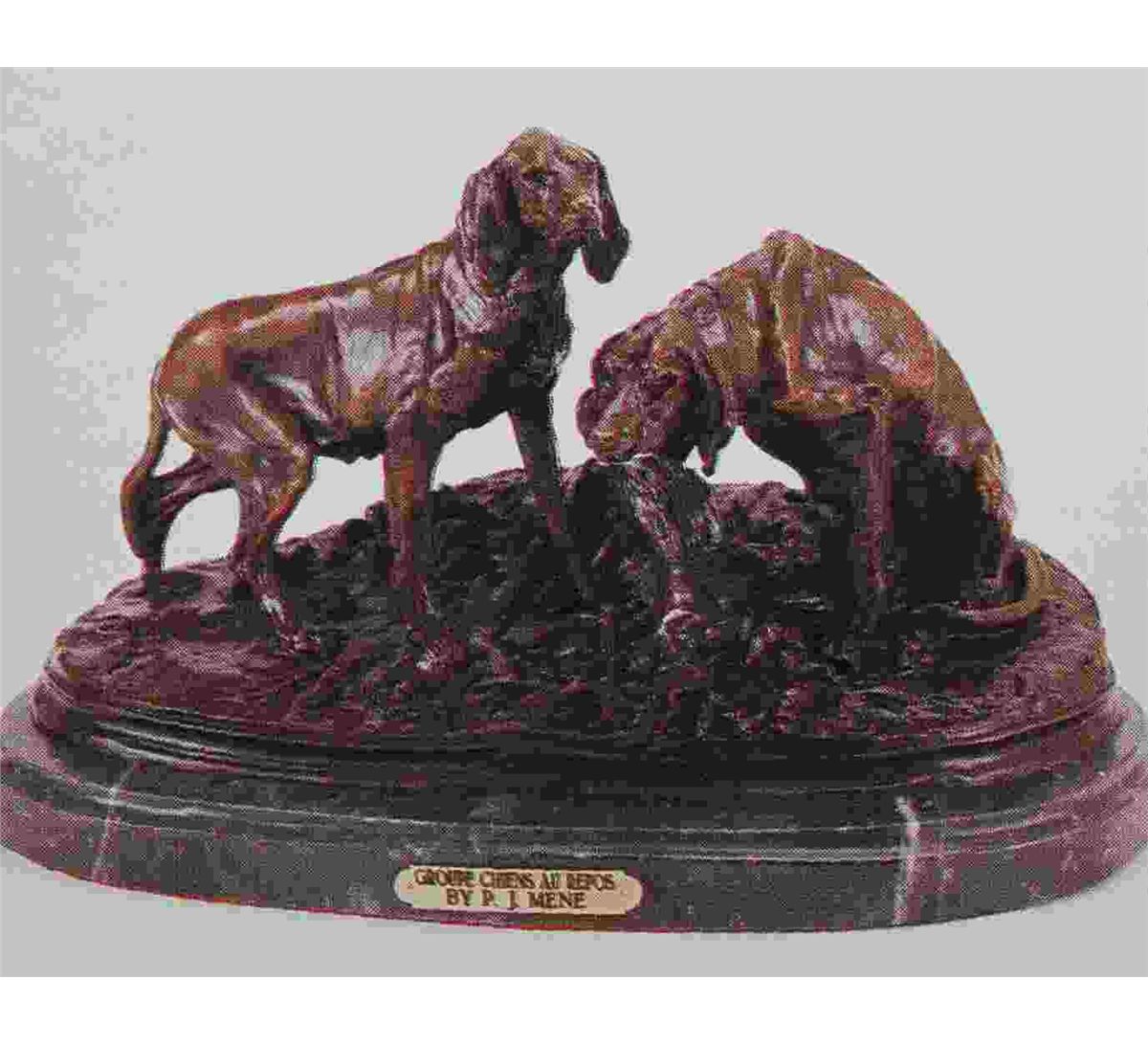 "Groupe Chiens Au Repos" Bronze Sculpture - After Mene - Museum Brown Finish - Mounted On A Fine Italian Marble Base - Beautifully Detailed - Signed - Mint Condition - 11"H X 19"W - Lost Wax Cast Bronze
