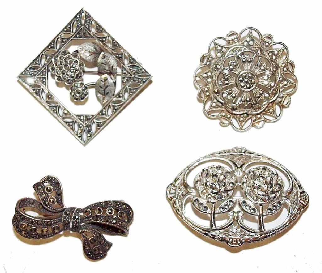 Group of four Interesting sterling silver Marcasite broaches in excellent condition. The mineral marcasite, sometimes called white iron pyrite, is iron sulfide(FeS2) with orthorhombic crystal structure. It is physically and crystallographically distinct from pyrite, which is iron sulfide with cubic crystal structure. Both structures do have in common that they contain the disulfide S22−ion having a short bonding distance between the sulfur atoms. The structures differ in how these di-anions are arranged around the Fe2+ cations. Marcasite is lighter and more brittle than pyrite. Specimens of marcasite often crumble and break up due to the unstable crystal structure. On fresh surfaces it is pale yellow to almost white and has a bright metallic luster. It tarnishes to a yellowish or brownish color and gives a black streak. It is a brittle material that cannot be scratched with a knife. The thin, flat, tabular crystals, when joined in groups, are called "cockscombs." In marcasite jewellery, pyrite used as a gemstone is termed "marcasite" – that is, marcasite jewellery is made from pyrite, not from the mineral marcasite. In the late medieval and early modern eras the word "marcasite" meant both pyrite and the mineral marcasite (and iron sulfides in general).[5] The narrower, modern scientific definition for marcasite as orthorhombic iron sulfide dates from 1845.[3]The jewellery sense for the word pre-dates this 1845 scientific redefinition. Marcasite in the scientific sense is not used as a gem due to its brittleness.