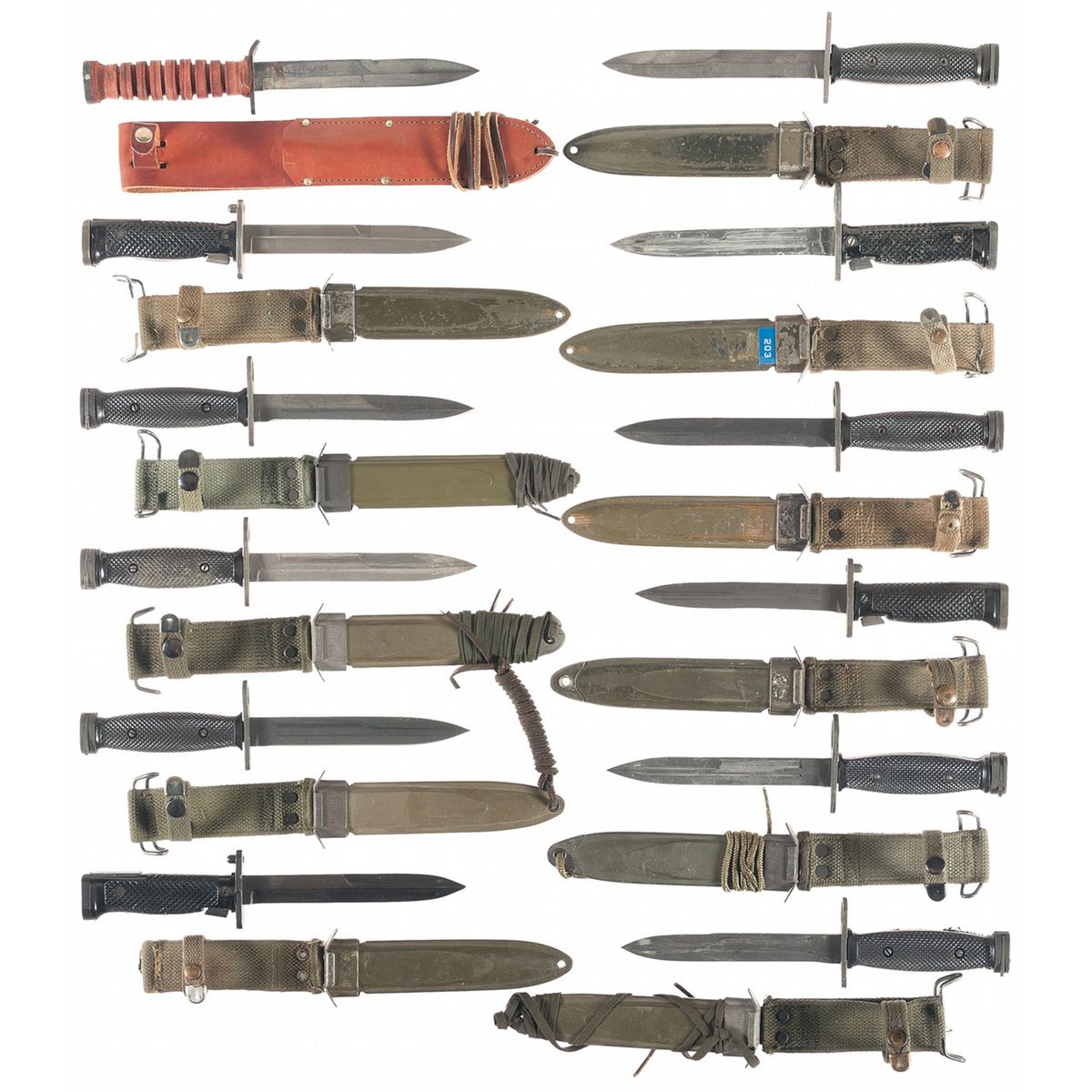 1) 1 Korean K-M7 bayonet. 2) 1 TMN M4 bayonet. 3) 1 Imperial M5 bayonet. 4) 3 K.I. M4 bayonets. 5) 2 Bren-Dan M4 bayonets. 6) 1 Utica M5 bayonet. 7) 1 Aerial M5 bayonet. 8) 1 Milpar Col M6 bayonet. 9) 1 Camillus M3 knife.