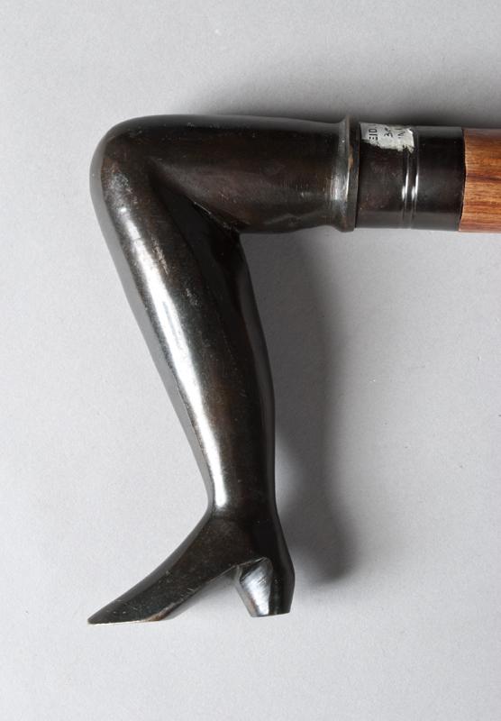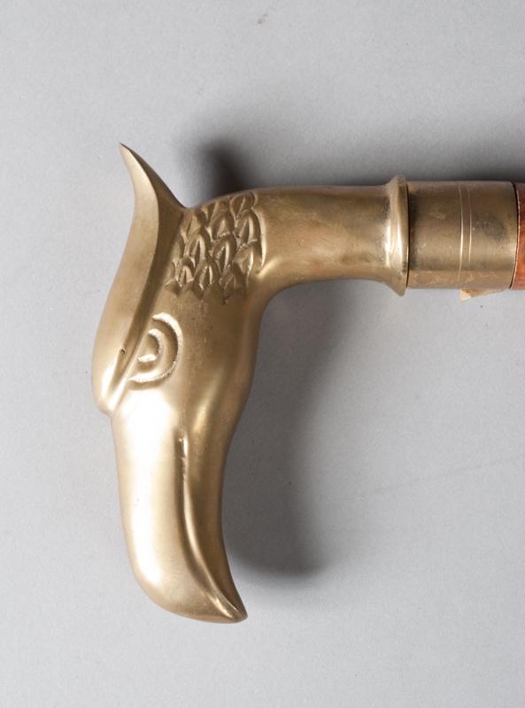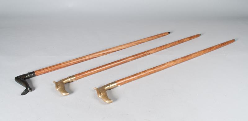 Includes a pair of walking sticks in wood with brass tips and brass bird form heads, 36" L. Together with a wood walking stick with metal tip and lady's leg head, 36" H. Good condition on all three, with minor wear from use.
