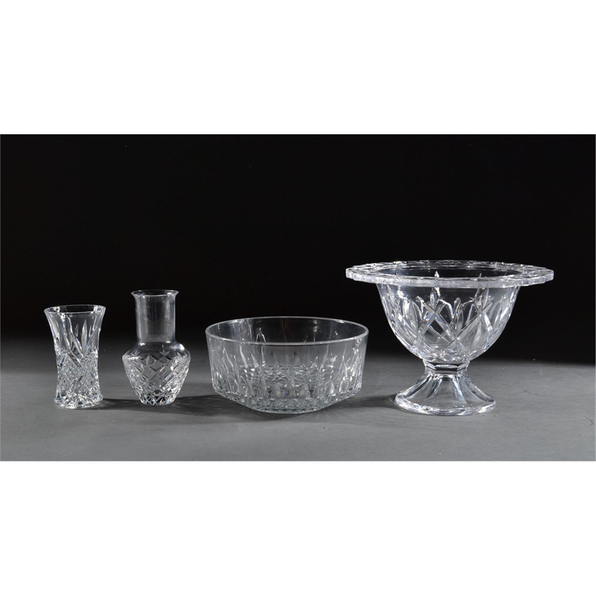 To include a large footed bowl in diamond pattern, a large bowl with diamond and starburst pattern marked Arcoroc France, a small vase with diamond and floral pattern, and another small vase diamond and wheat pattern. Largest 6.5" H x 9.5" W. Circa 20th century. Private collection St. Clair Shores, MI.