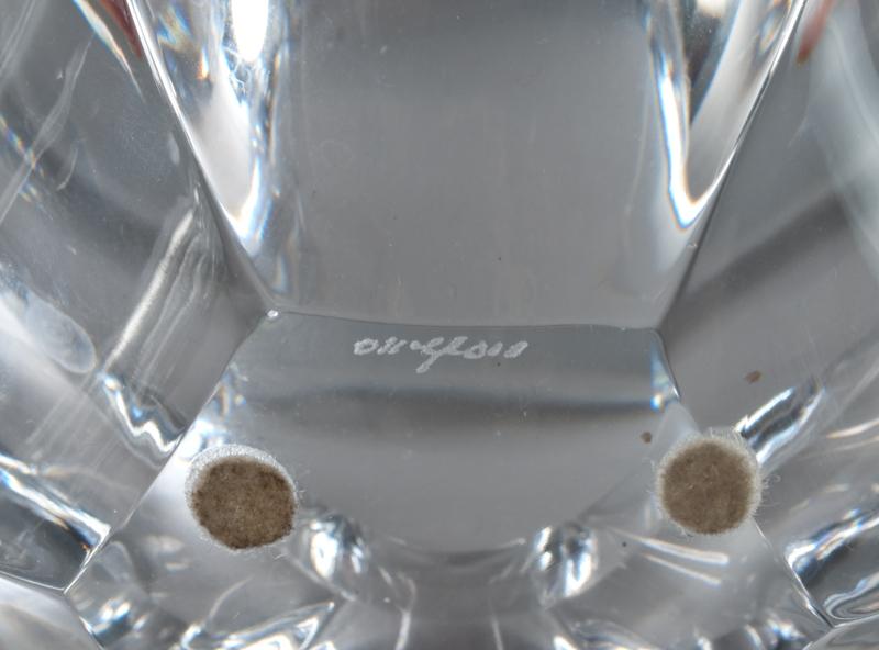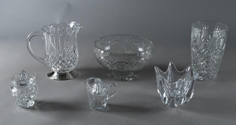 Includes a footed bowl decorated with frosted sections of grape and leaf designs, 5 & 5.8" H x 9.5" Dia.; chip on underside of foot. An Orrefors crystal tulip form vase,5" H x 6.25" W, signed on underside. A pitcher with scalloped rim on metal foot, 8.25" H, 3" interior crack near top. A wide mouthed vase 8.75" H x 5 & 5/8" Dia. A creamer with frosted floral designs, with separate foot, 5.75" H. And a covered sugar bowl with spoon, 5.5" H.