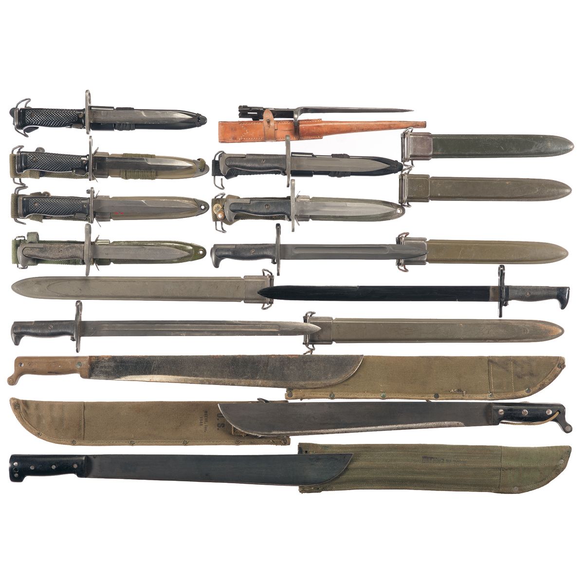 Lot includes three machetes, a Johnson Automatic Rifle bayonet, a U.S.N. Mark I training bayonet, 2 loose sheaths and 8 other bayonets. All are fair or better.