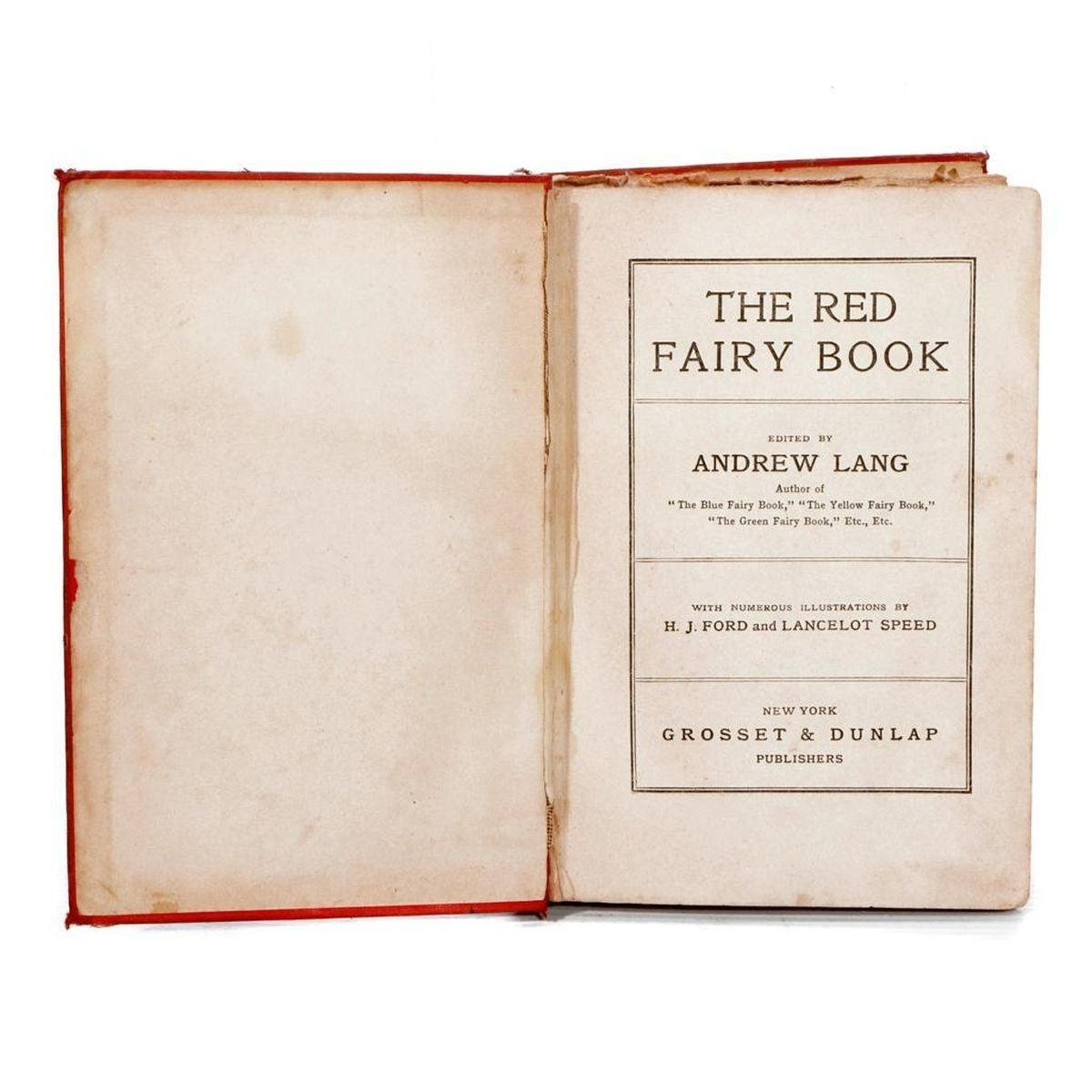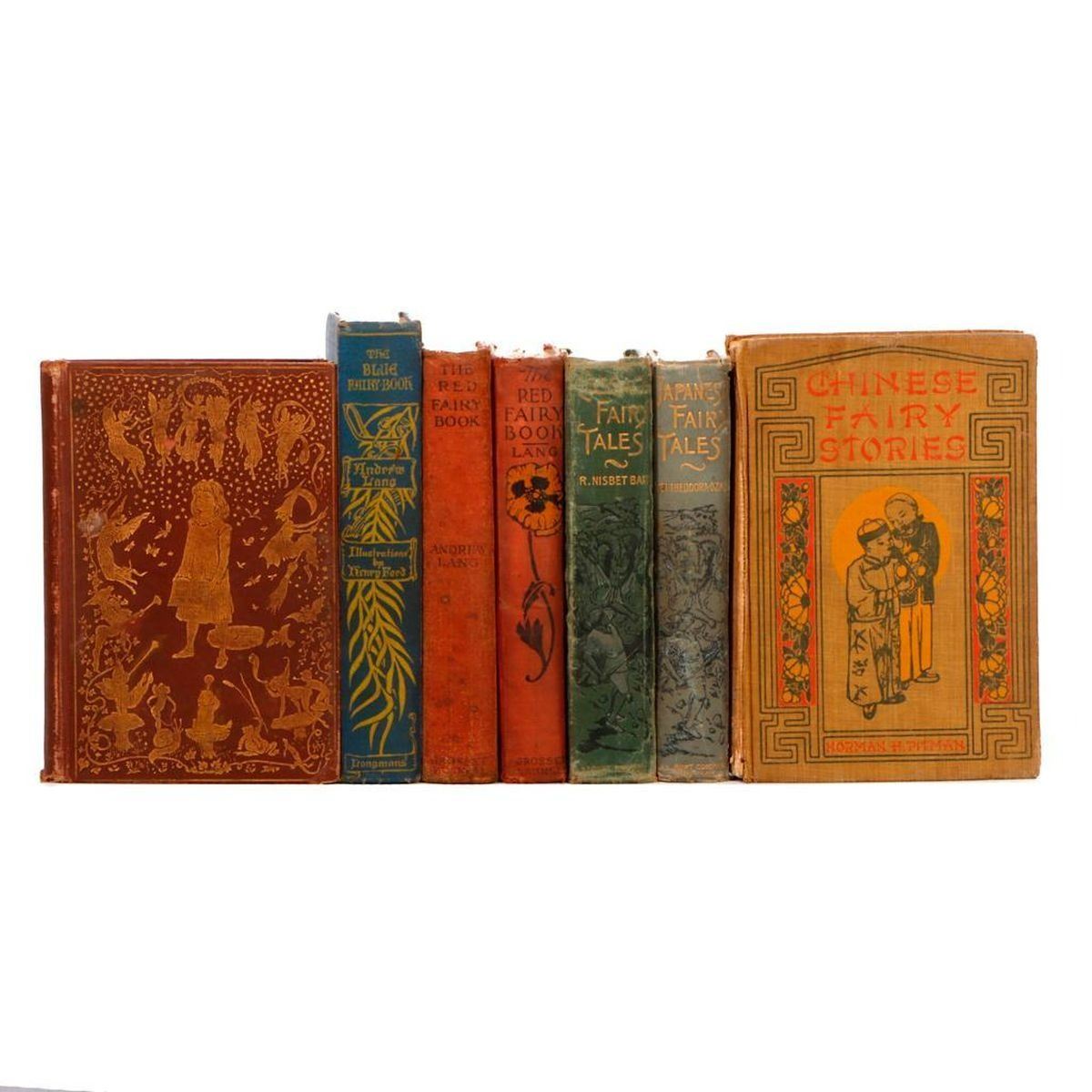 Includes one volume inscribed by artist Xavier Martinez, to his wife and daughter, 1913, with his monogram stamp. The group Poor-Fair condition, with wear/soiling, splitting/loose, inscriptions and child marks. LANG, ANDREW. London, etc.: Longmans, Green, & Co: 1.) The Blue Fairy, 1947. 2.) The Brown Fairy Book, 1904; inscribed by Xavier Martinez, Micaela's doodles. 3.) The Red Fairy, The Lang Fairy Series, missing copyright and title pages, other pages loose. 4.) The Red Fairy, New York: Grosset & Dunlap, n.d., copyright page missing, split at front and back. Together with: 5.) BAIN, NISBET. Cossack Fairy Tales and Folk-Tales. New York: A. L. Burt, 1894. Split at front and back. 6.) OZAKI, YEI THEODORA. Japanese Fairy Tales. New York: A. L. Burt Company, 1903. Split at front. 7.) PITMAN, NORMAN. Chinese Fairy Stories. New York: Thomas Y. Crowell Co, 1910. Cloth missing from spine, loose. From the Family of Xavier Martinez (1869-1943), Elsie Whitaker Martinez (1890-1984), and Micaela Martinez DuCasse (1913-1989).