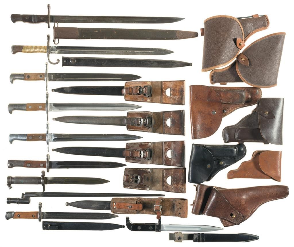 8 bayonets with scabbards with leather frogs, one spike bayonet, one Russian bayonet without scabbard, one leather frog, one U.S. marked holster with lanyard and 6 European holsters (2 with lanyards, 2 with cleaning rods, 1 with magazine).